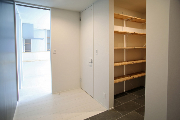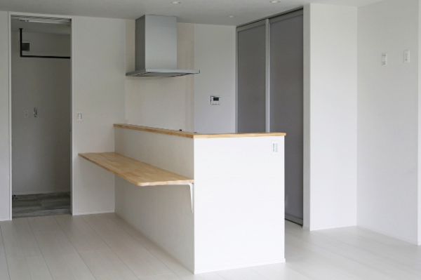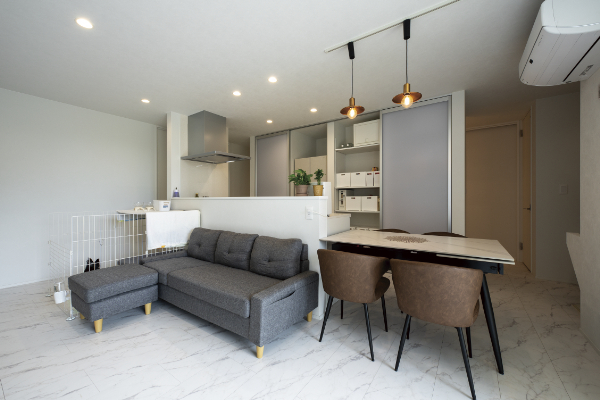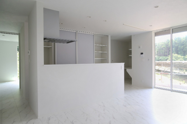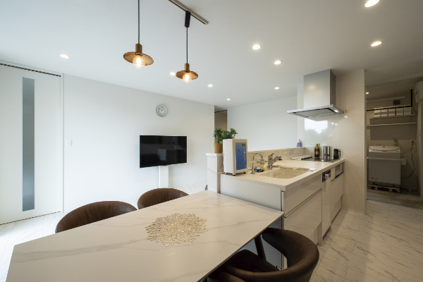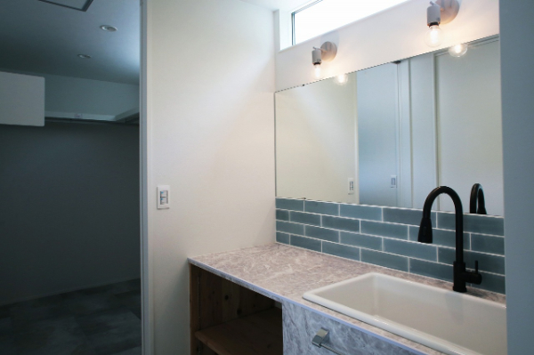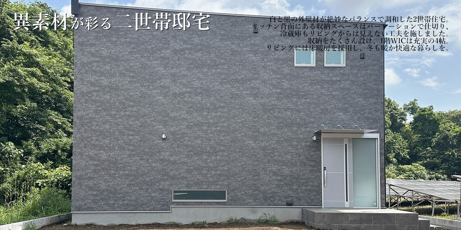 2世帯住宅、床大理石、アイカスタイリッシュ洗面、パーテーションキッチン収納、異素材の外壁材