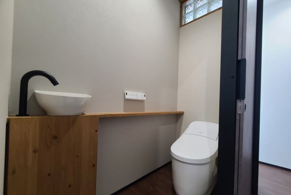 耐震等級3、C値:0.3、長期優良住宅など、性能を重視した家。 性能だけでなく、モルタル調の建具を使用したデザインも、ランドリー=脱衣所=洗面室を行き来しやすくした動線も、全てにおいてこだわりました。