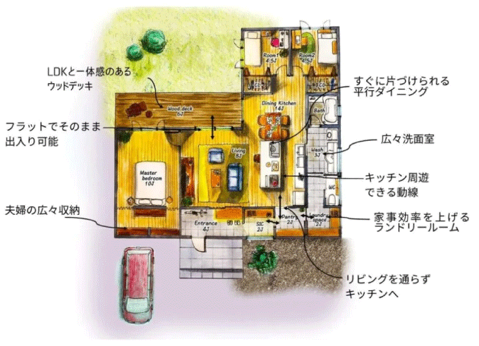 すべての部屋が同じフロアにある平屋は、炊事や洗濯、掃除などの家事をラクに行える家事動線がつくりやすこともポイントです。