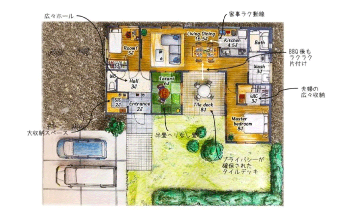 暮らしに“囲む”安心を。 L字型に配置された空間は、外からの視線をやさしく遮り、家族だけのプライベートガーデンを中心に、自然と笑顔が集まる場所に。 風と光がめぐる快適な動線、BBQや家庭菜園も楽しめるテラス。開放感と安心感を両立した、ワンフロアの上質な暮らしを実現します。
