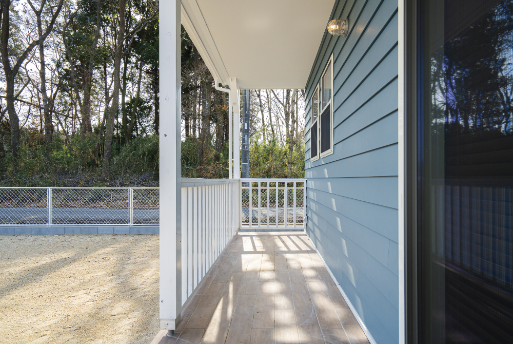 ラップサイディング、天井板張り、カバードポーチ、勾配天井、タイル張り、モールテックス、OSB、木目調タイルデッキ